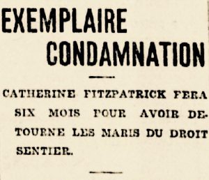 Catherine Fitzpatrick, rôdeuse de nuit, a été condamnée par Son Honneur le recorder Dupuis à 6 mois de prison, $25 ou trois autres mois.