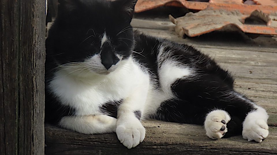 Ce chat adolescent vit une vie impossible à connaître. Je suis dans un rang, les voisins sont bien loin. Pour manger, ce chat peut se présenter. Et il peut s’absenter pendant plusieurs jours. Il est arrivé le 3 octobre vers midi pour manger. Et il fut de retour aujourd’hui. Il attendait sur la galerie avant. Je vais vous dire : pendant qu’il mangeait, je le flattais et le flattais.