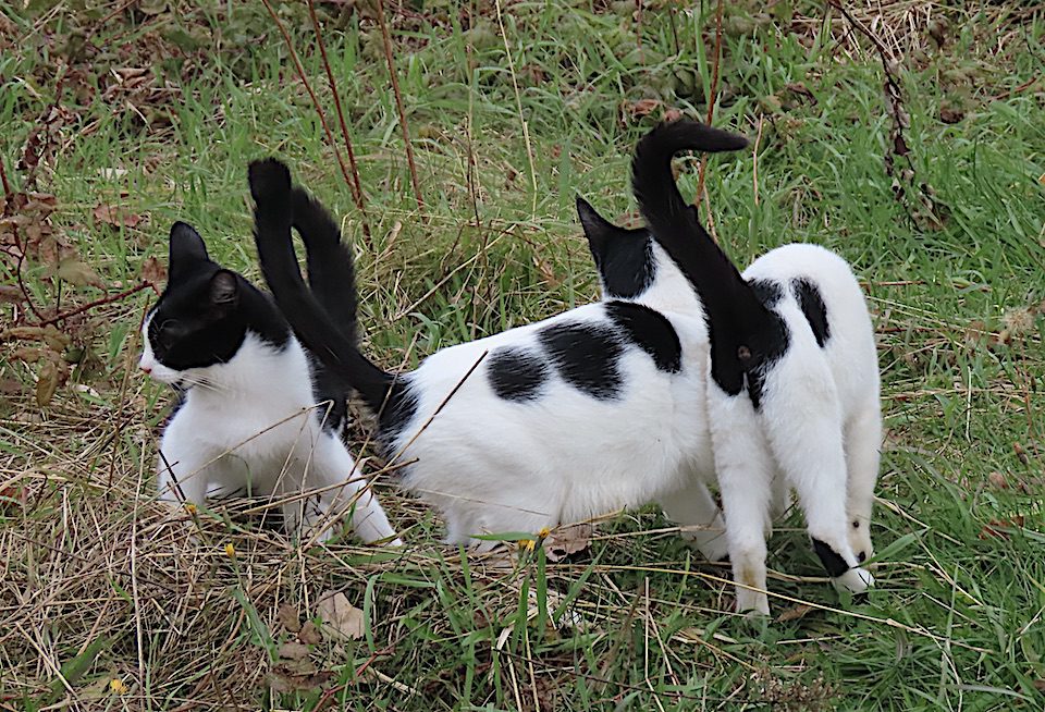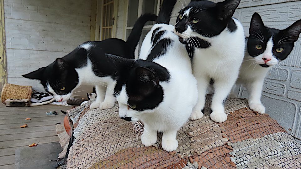 La chatte et trois chatons sur la corde de bois sur la galerie arrière.