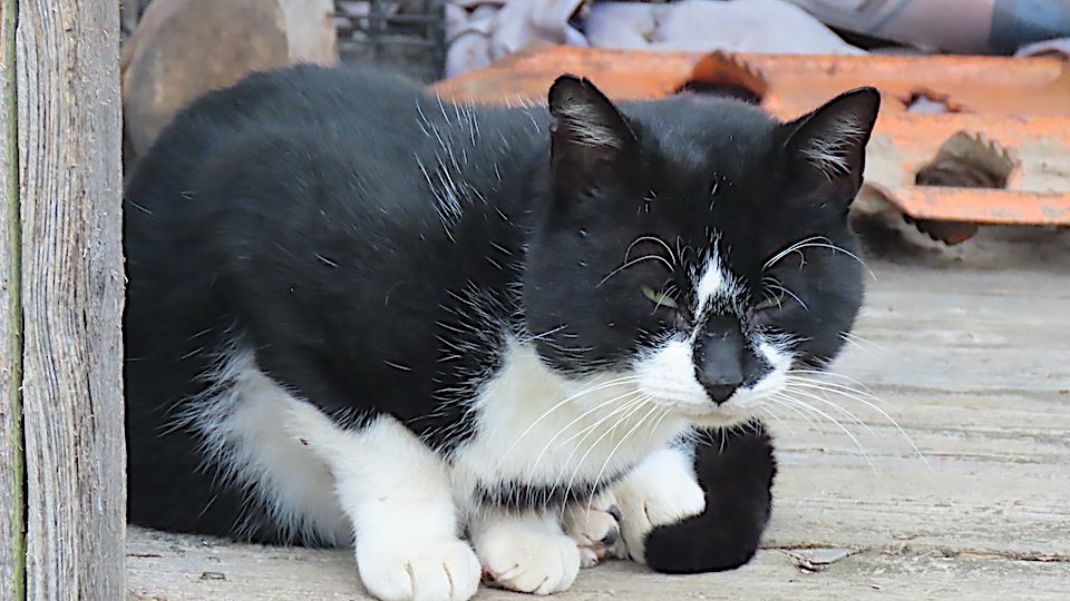 À mon arrivée, cet avant-midi, le chat adolescent était déjà sur la galerie avant, sans doute pour de la nourriture.
