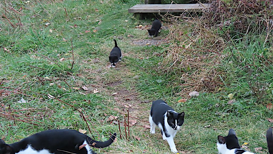 J’arrive, hier avant-midi. Deux jeunes chatons viennent rejoindre trois chatons plus vieux.