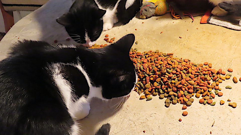 À mon arrivée, hier matin, quelques chatons s’occupent à manger des croquettes sur la table.