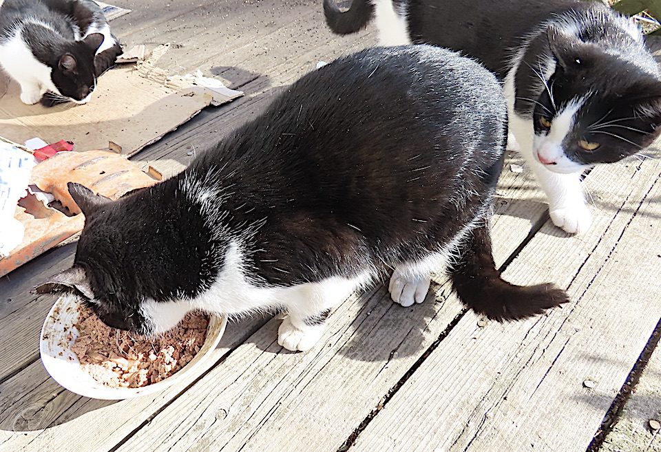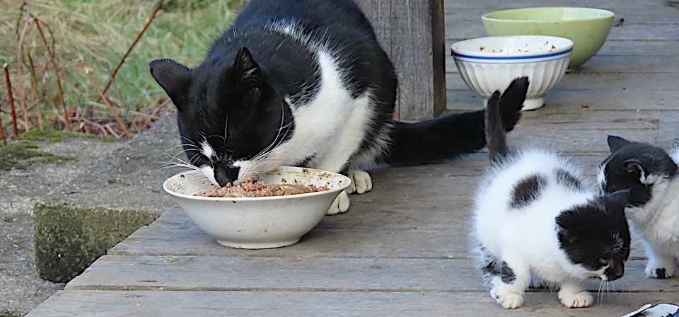 Le chat adolescent mange maintenant sur la galerie avant. J’ai changé l’emplacement du dîner pour ce chat.
