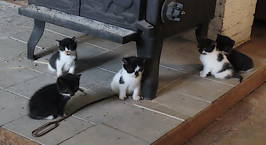 Cinq très jeunes chatons près du poêle.