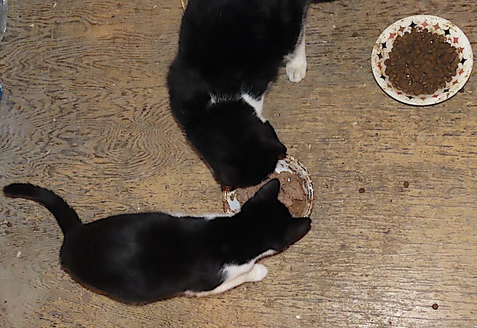 Deux chatons mangeant ensemble.