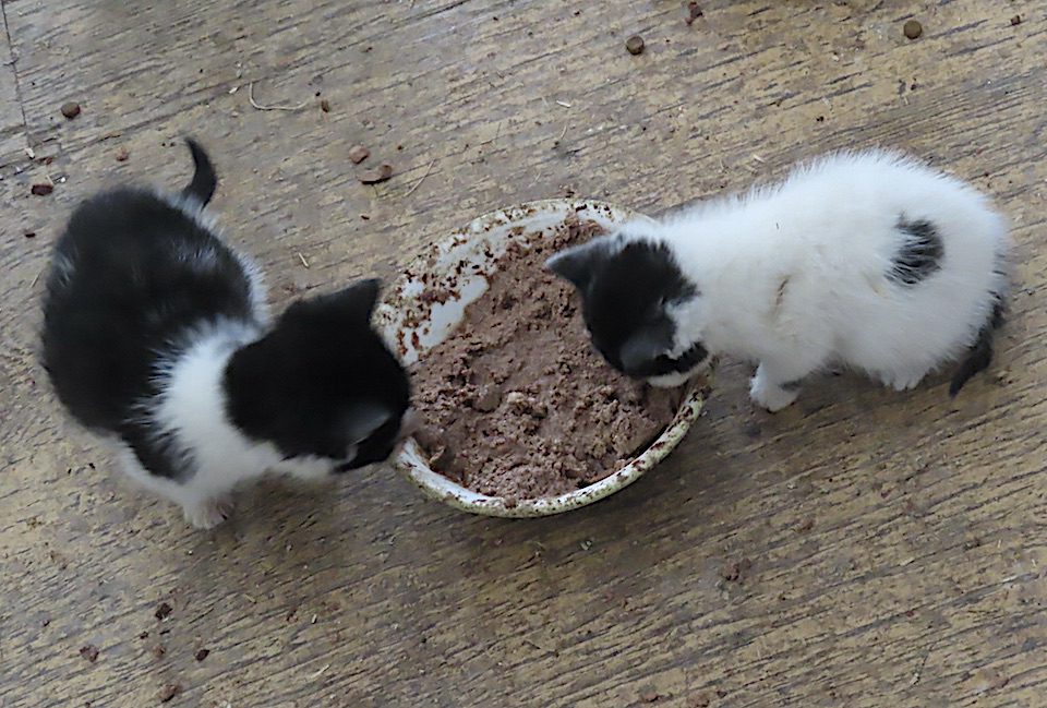 Deux jeunes chatons y vont d’une assiette de viande.