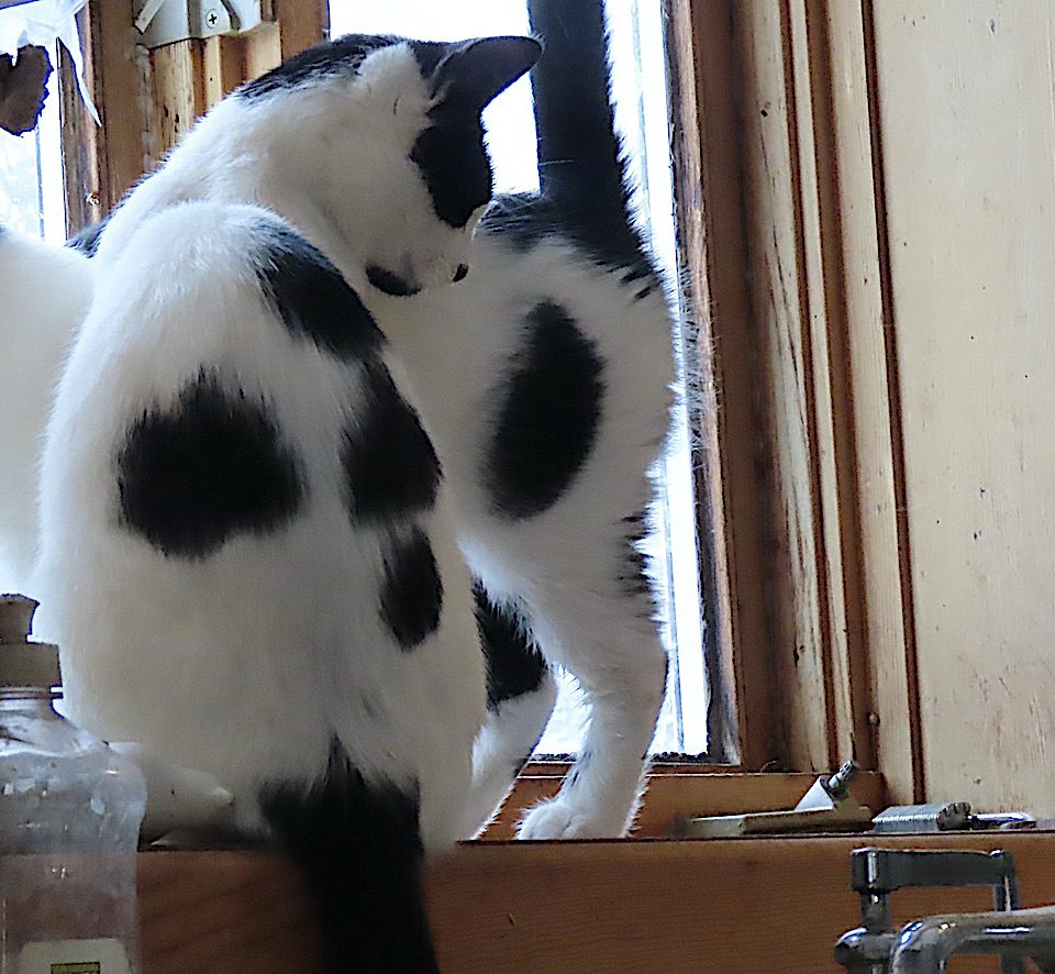 La chatte vue de dos, sur la tablette au-dessus de l’évier.