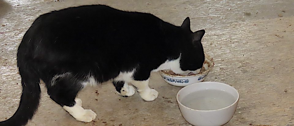 Le chat adolescent mange de la viande.