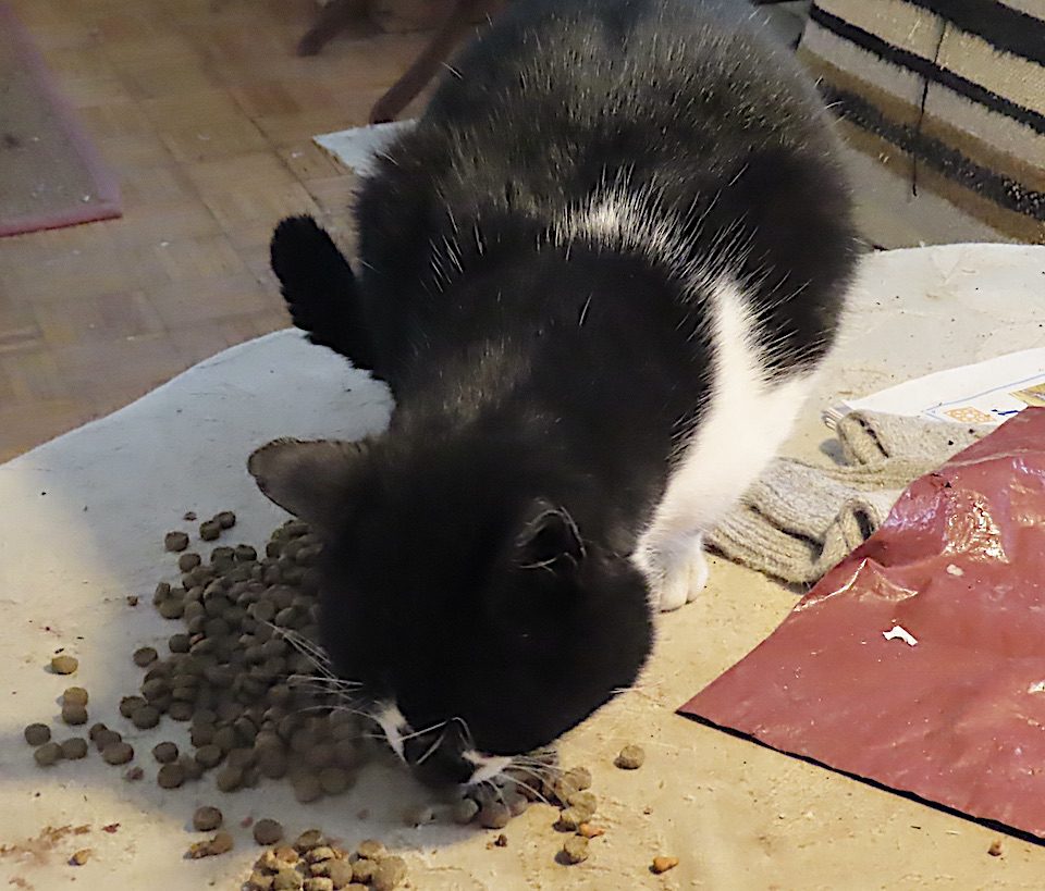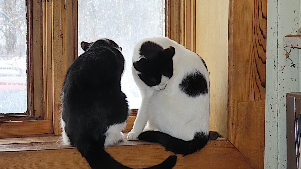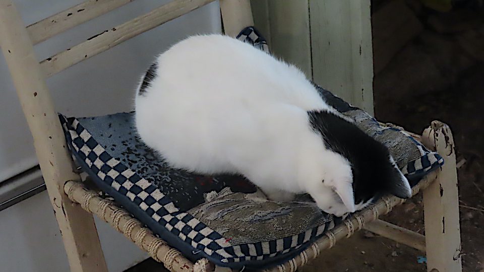 La chatte avec un jeune, sur la tablette au-dessus de l’évier.