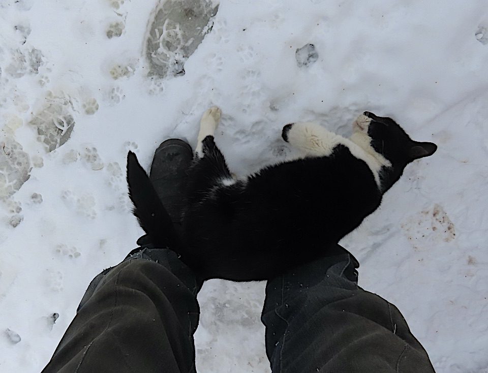 Hier matin, le chat adolescent m’attendait sur la galerie arrière. Et il est venu se mettre sur mes bottes.