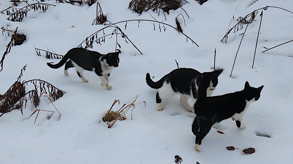 À mon arrivée, hier avant-midi, trois des chats ayant passé la nuit dehors me tournaient autour. Bien sûr, je leur ai proposé d’entrer dans la maison.