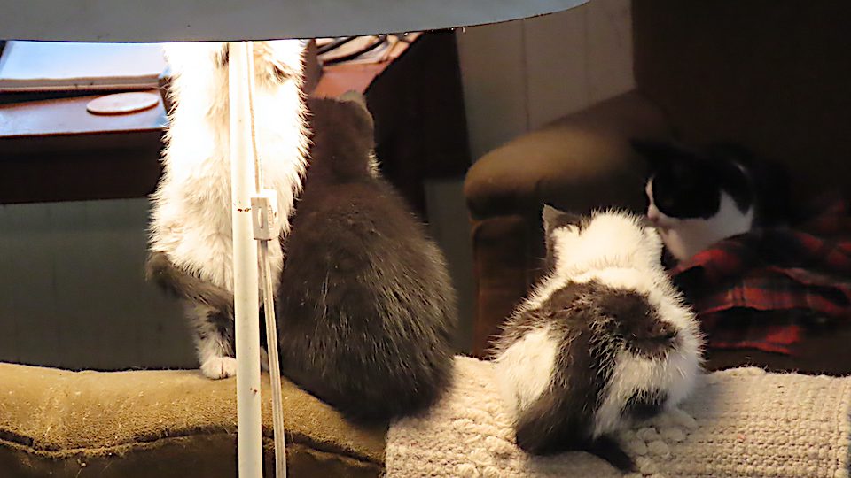 Deux chatons sous la lampe et l’un, à l’arrière, dans le fauteuil de mon père autrefois.