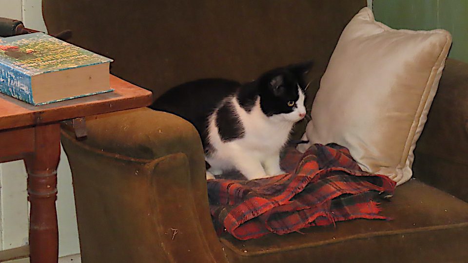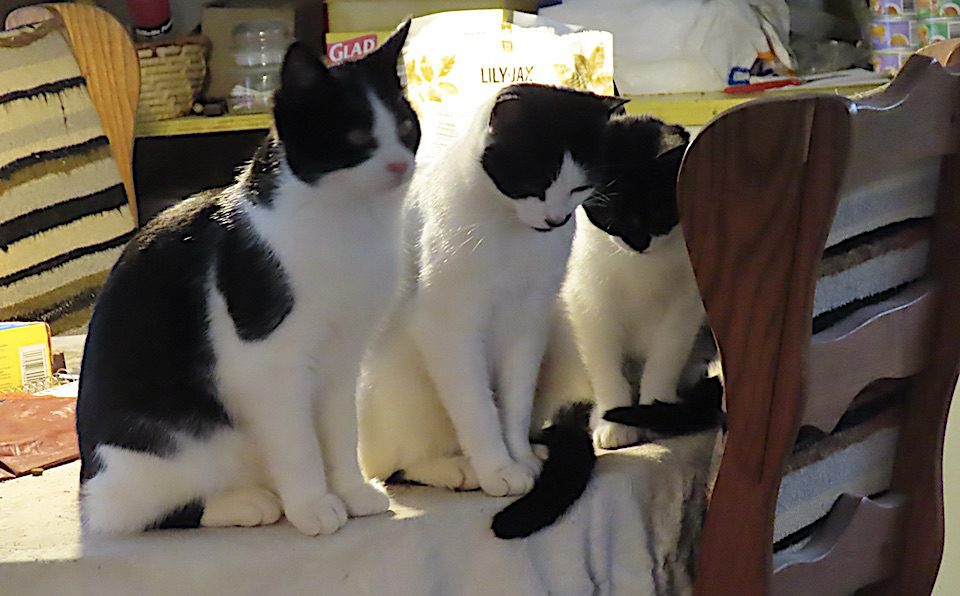 À midi 25, hier, j’ai eu une grande joie. Le chat adolescent se présente à la galerie arrière. J’étais tellement réjoui. Il est entré rapidement. Il va vivre avec les autres sur les deux étages jusqu’à cet avant-midi. Je l’aime beaucoup. Et il se laisse flatter par moi maintenant.