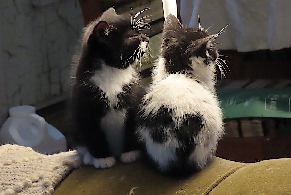 Dans le haut d’une chaise, avec sa mère, un chat né au printemps dernier.