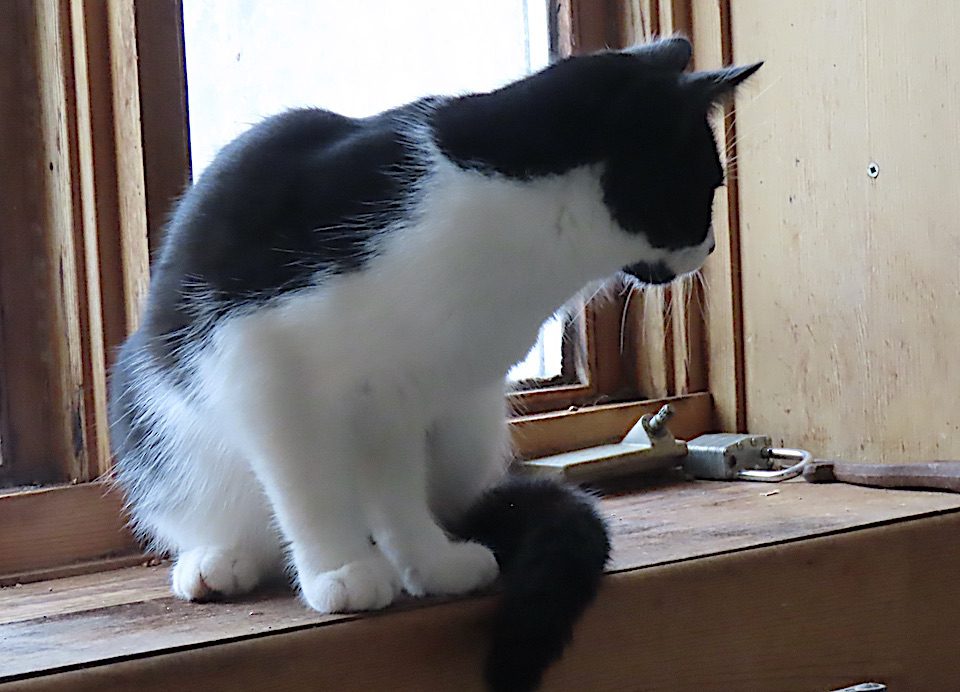 Un chat sur la tablette au-dessus de l’évier.