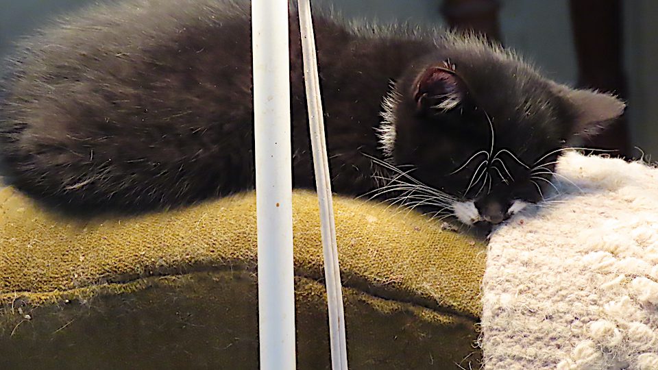 Un chaton dort sous la lampe.