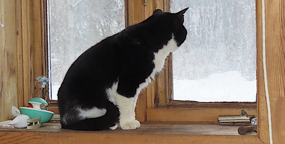 Le chat adolescent sur la tablette au-dessus de l’évier.