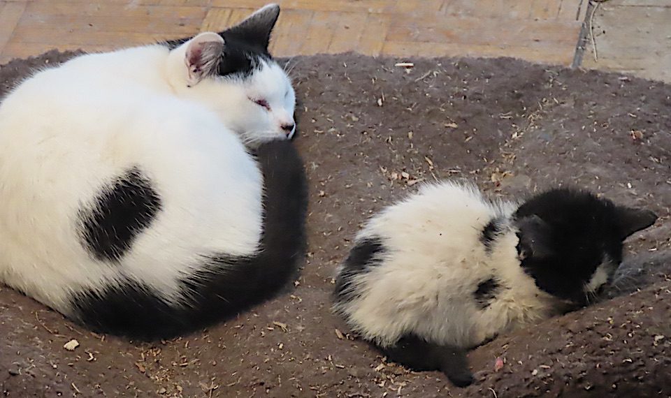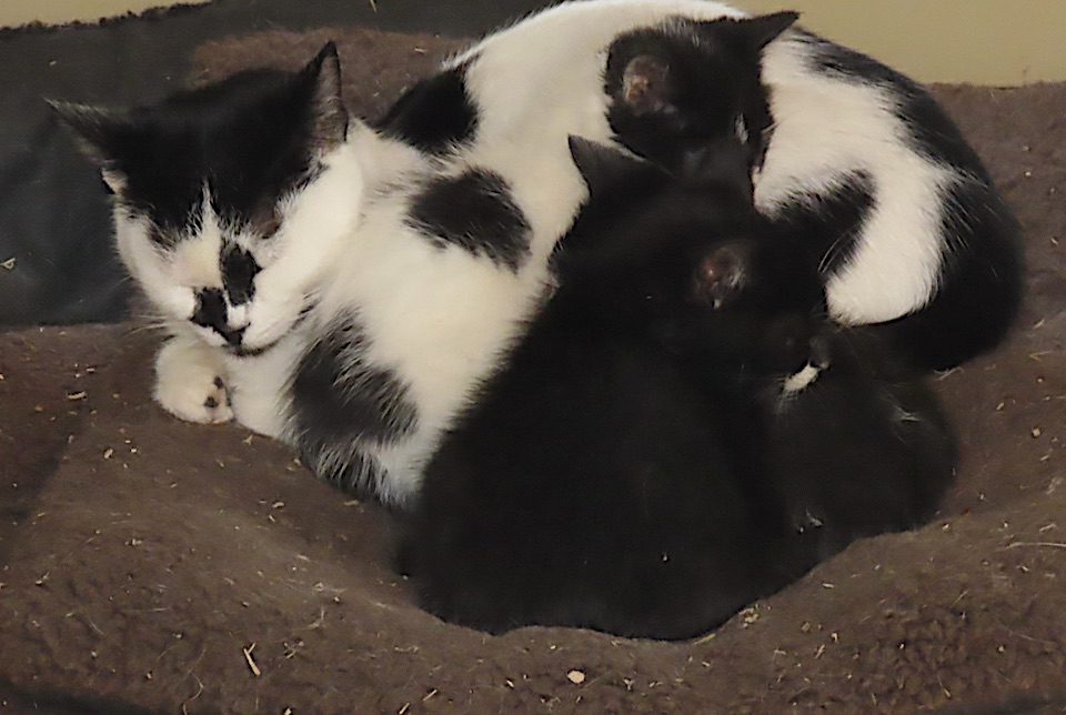 Ailleurs, sous un table de travail, un chat et deux tout jeunes se reposent.