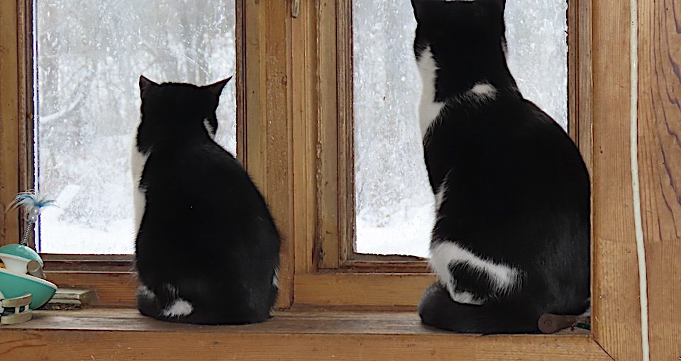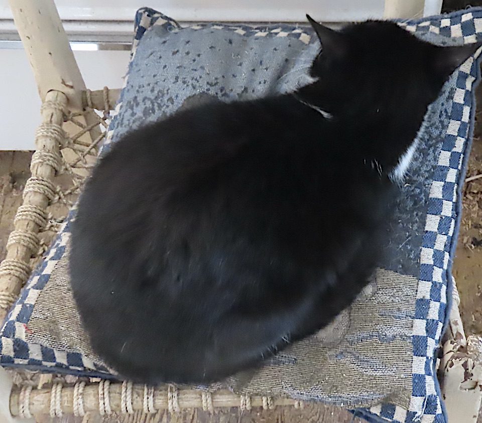 Hier matin, le chat adolescent m’attendait sur la galerie arrière. Et il est venu se mettre sur mes bottes.