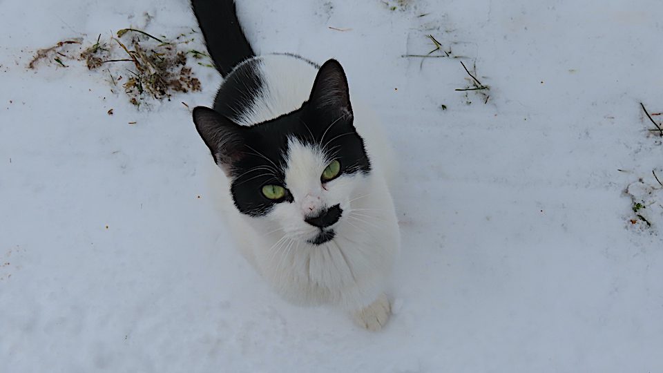 Absente depuis une journée, la chatte est venue se placer à mes pieds, avant notre entrée dans la maison.