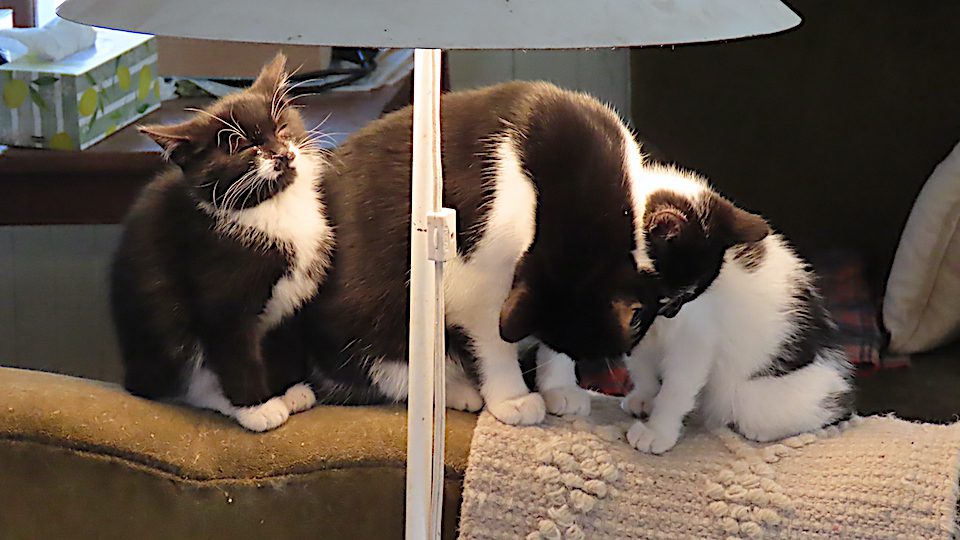 Hier avant-midi, deux jeunes chatons et un chat sous la lampe.
