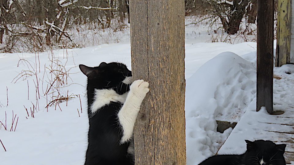 Et, pendant ce temps, un des chats monte dans un des poteaux de la galerie arrière.