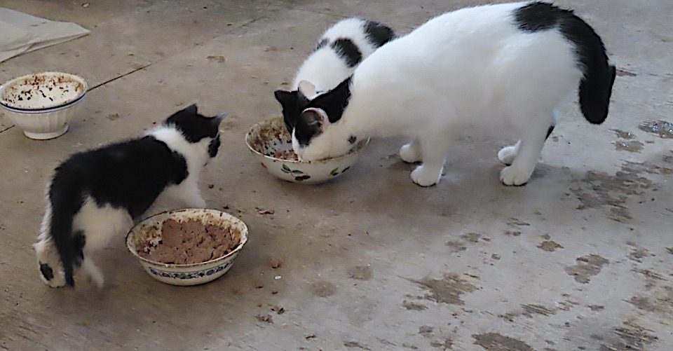 Le jeune chaton s’en va goûter à ce que mangent les deux autres.