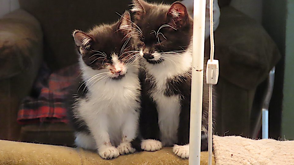 Dans le maison, deux des jeunes chatons sont sous la lampe.