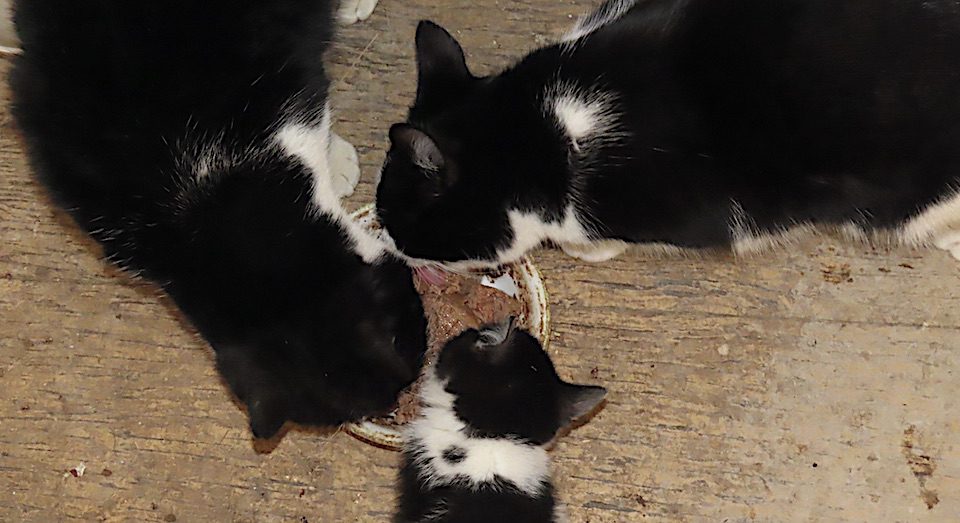 Le très jeune chaton mange avec à sa gauche le chat adolescent.