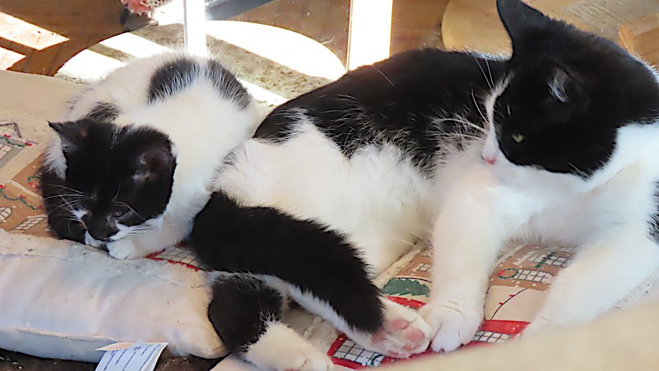 Les deux chats dorment un à côté de l’autre, chacun ayant son coussin.