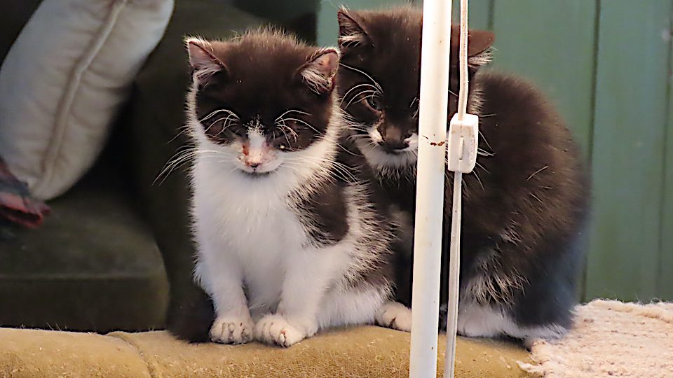 Deux très jeunes chatons sous la lampe.