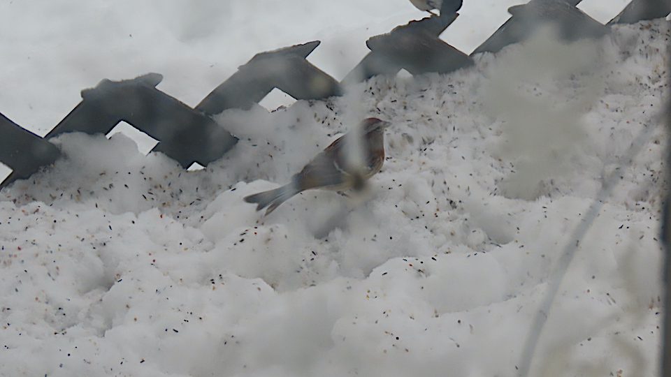 Il y a 6 ou 7 Bruants hudsoniens qui sont arrivés hier. Ils secondent la Mésange à tête noire à peu près seule depuis un mois. L’Hudsonien est un oiseau d’hiver. Il porte un point noir à la poitrine et la calotte brun-rouge unie. Je l’ai photographié de l’intérieur de la maison.