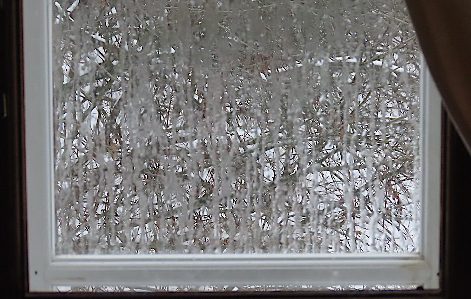 La pluie vient de l’est, du verger. Et elle laisse sa glace dans les fenêtres de ce côté.