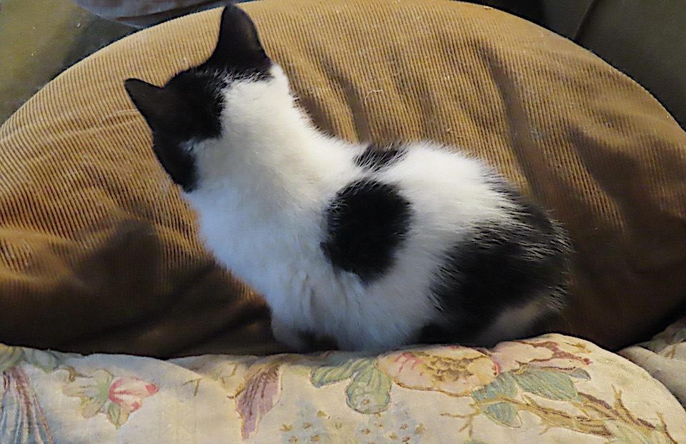 Un des jeunes chatons dans des coussins sur la causeuse.