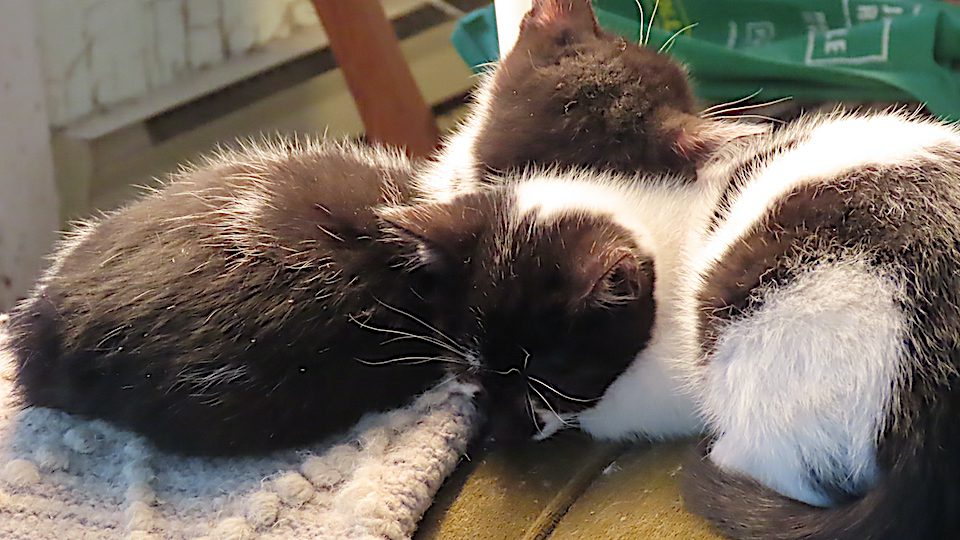 Deux des trois jeunes chatons continuent de se tenir sous la lampe.