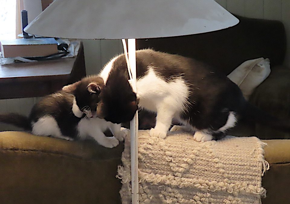 Hier avant-midi, trois jeunes chatons et deux chatons plus âgés mangeaient des croquettes. Et l’un est debout en train de s’en prendre au recouvrement d’une des chaises.