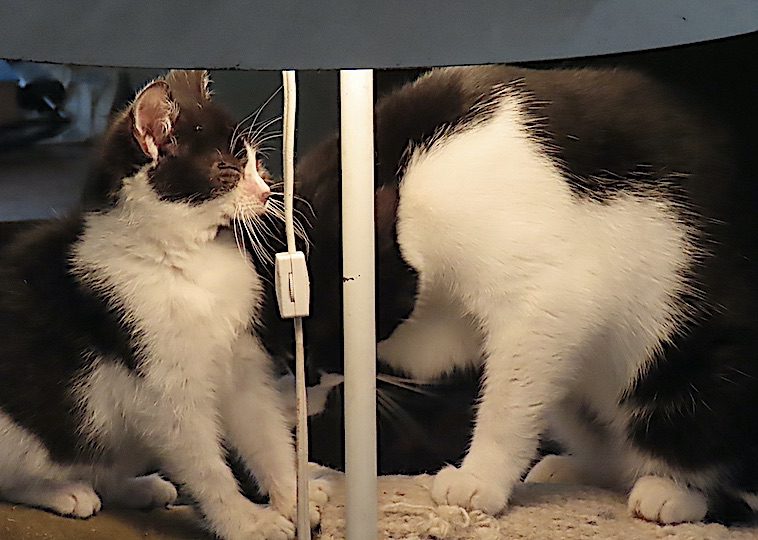 Sous la lampe, voilà un jeune chaton, qui reçoit une douce main à l’épaule.