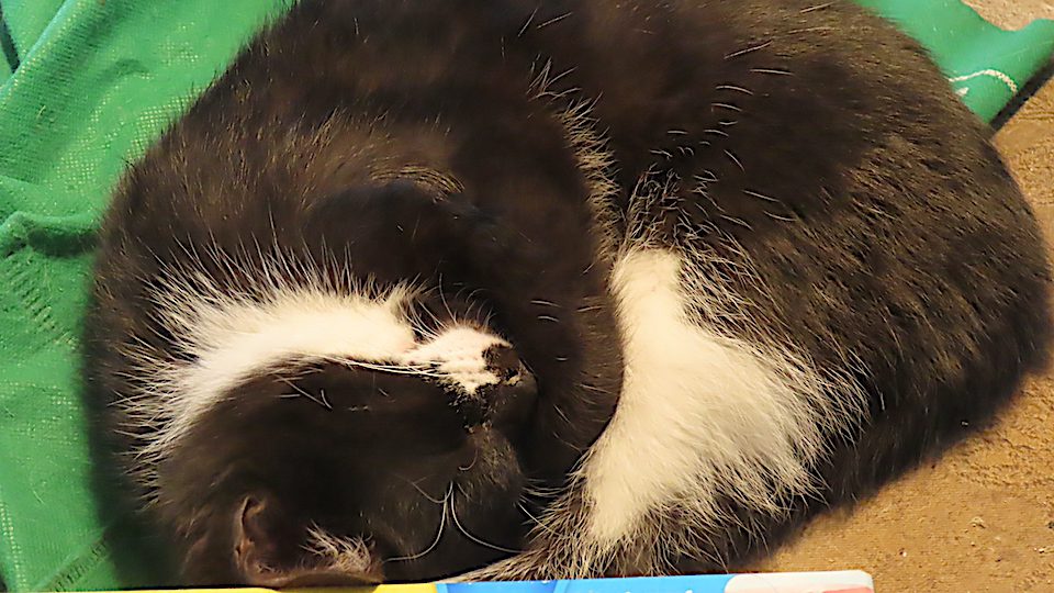 Ce très jeune chat né le 4 octobre dort sur la table.