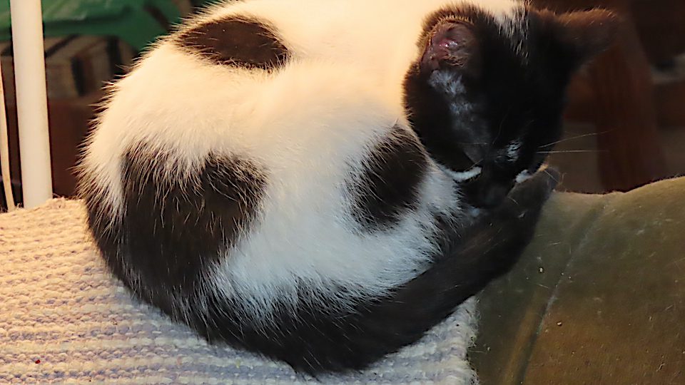 Un des trois jeunes chatons, dormant, sous la lampe.