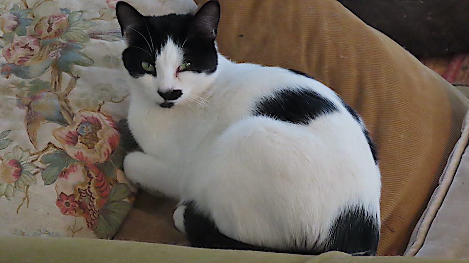 La chatte retrouve sa place dans les coussins de la causeuse.