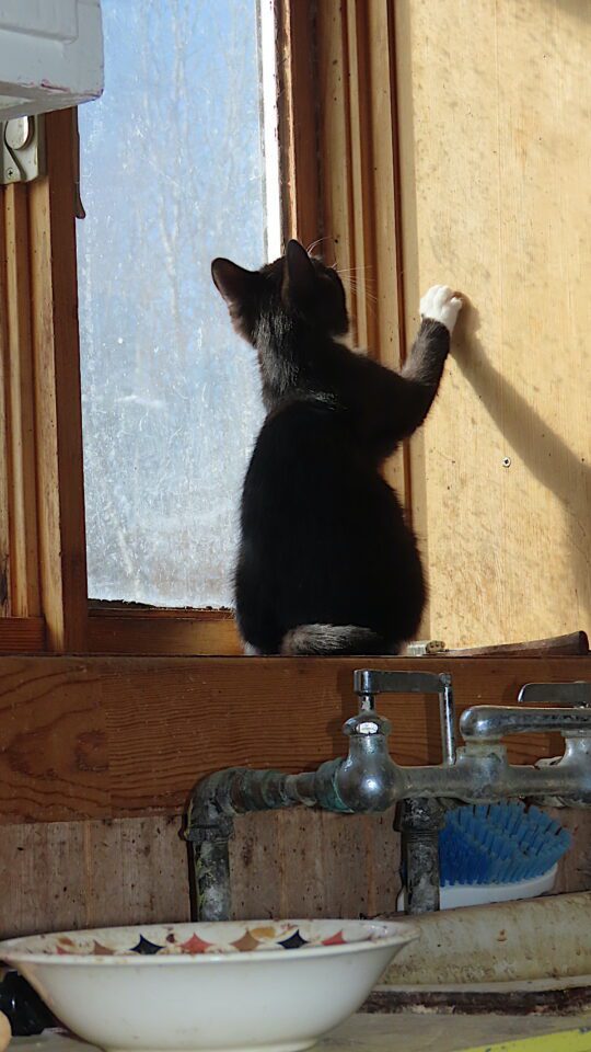 Ce jeune chaton voit un insecte près de cette vitre.