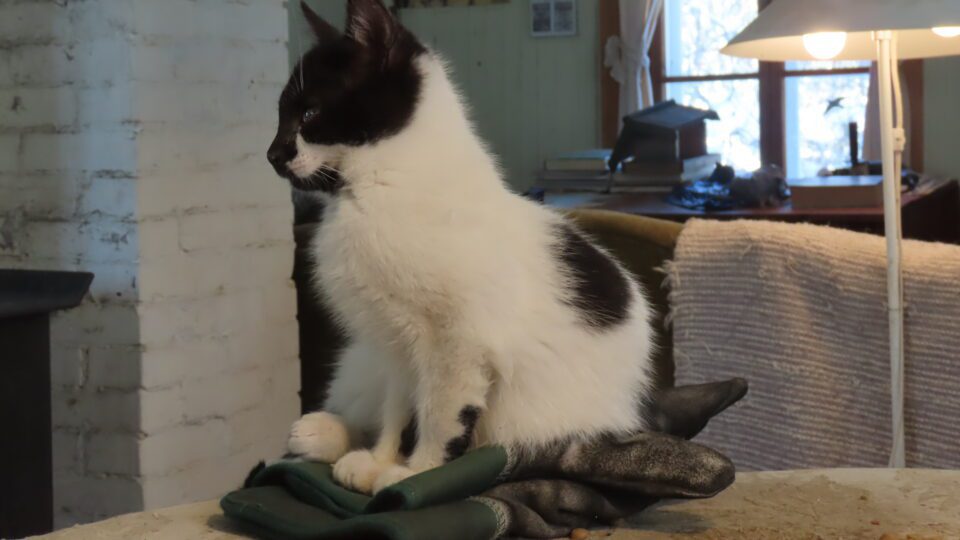 J’ai laissé mes gants de travail sur la table et ça fait le bonheur d’un des chatons, qui sait comment les utiliser.