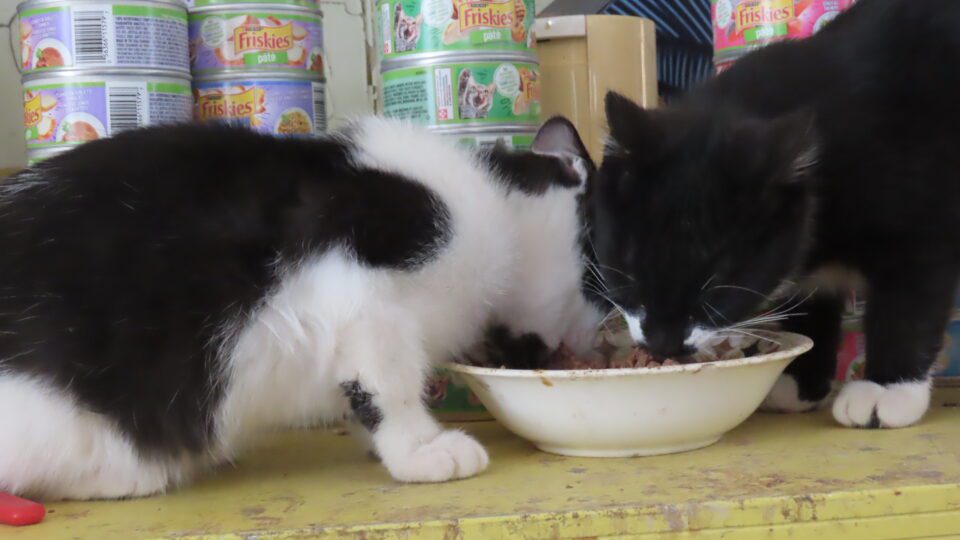 Deux des trois jeunes chatons mangent ensemble sur la galerie à l’intérieur.