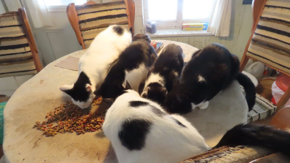 Voyez, ils sont cinq sur la table à manger des croquettes. Devant les quatre en ligne, c’est la chatte.