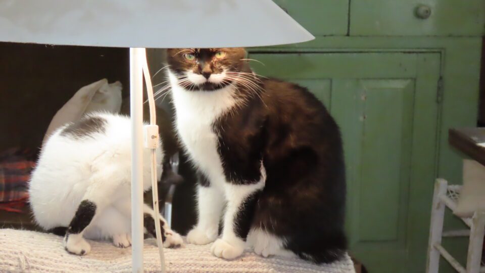 Voilà deux chats magnifiques sous la lampe.