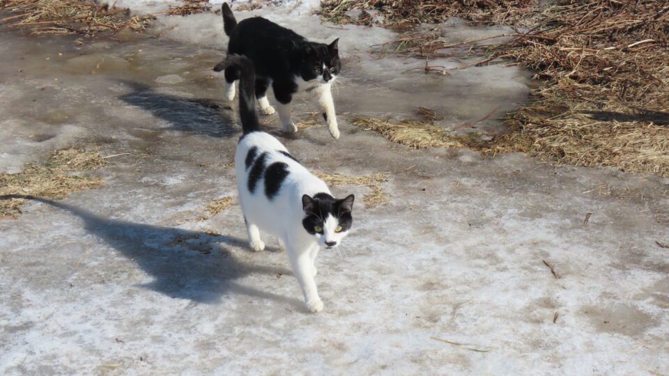 Pour me saluer lors de ma venue en avant-midi, hier, la Chatte suivi du chat adolescent arrivent près de la maison, sur de la glace après la pluie de la veille.