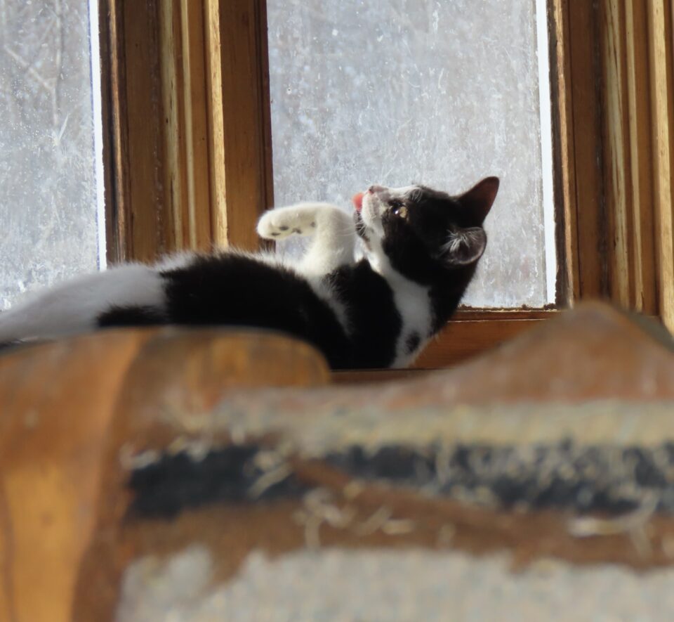 Le chat dans la vitrine ouest, au rez-de-chaussée.