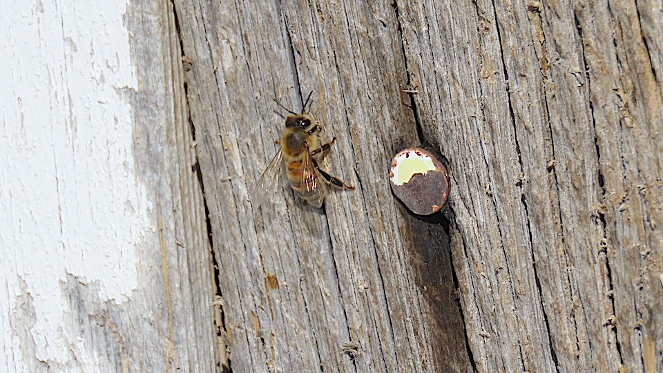 Voici ce qui semble être une Abeille domestique, devenue sauvage. Et il y en a plusieurs dans les murs de la maison, au sud-ouest, mais elles ne font pas de dégât. Et depuis de nombreuses années. La maison les fait vivre. Mais, en hiver, elles trouvent le temps qu’il fait difficile, et en meurent. Je les retrouve dans la neige.