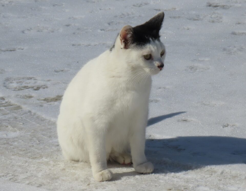La chatte est dans la neige et trois autres chats sont près de moi.