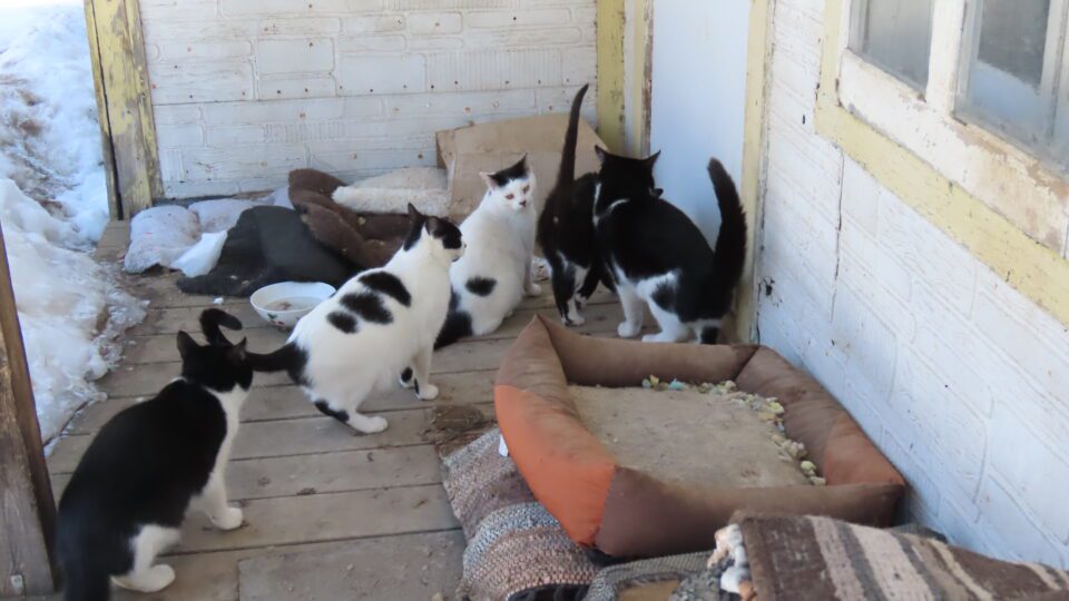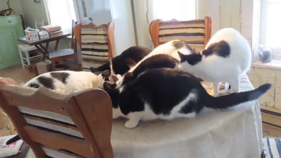 Hier avant-midi, à ma sortie de l’auto, cinq chats viennent me voir.
